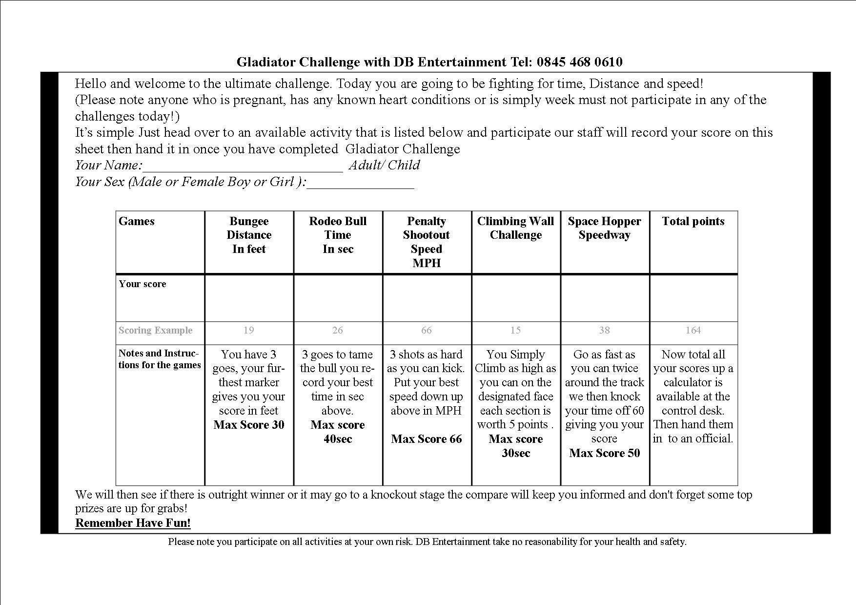So we have developed "Gladiator Challenge" to simplify and combine its a knockout with a corporate family fun day. We can combine any of the items listed below the example below. You can see this is an individual or team game which encourages more participants to take part in the activities provided especially if there's a good prize up for grabs for the winners. We would normally do categories, for example, Adult Male and Female, Under 10s Boy and Girl, 11 and Over Boy and Girl.