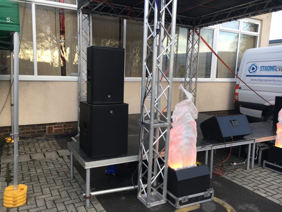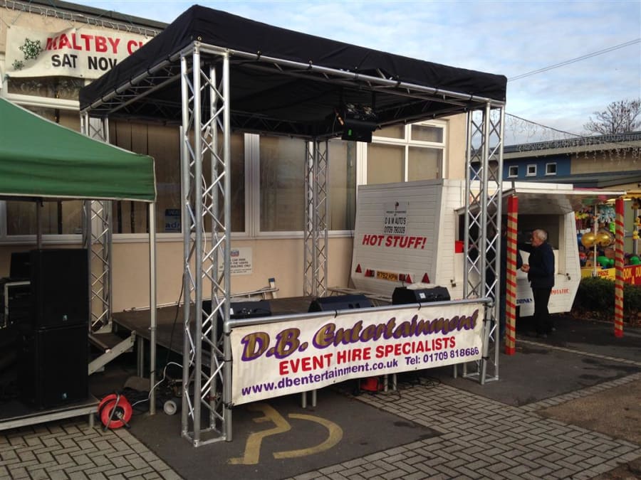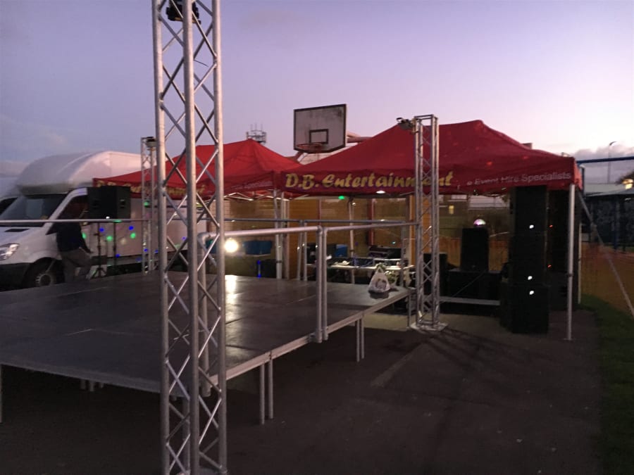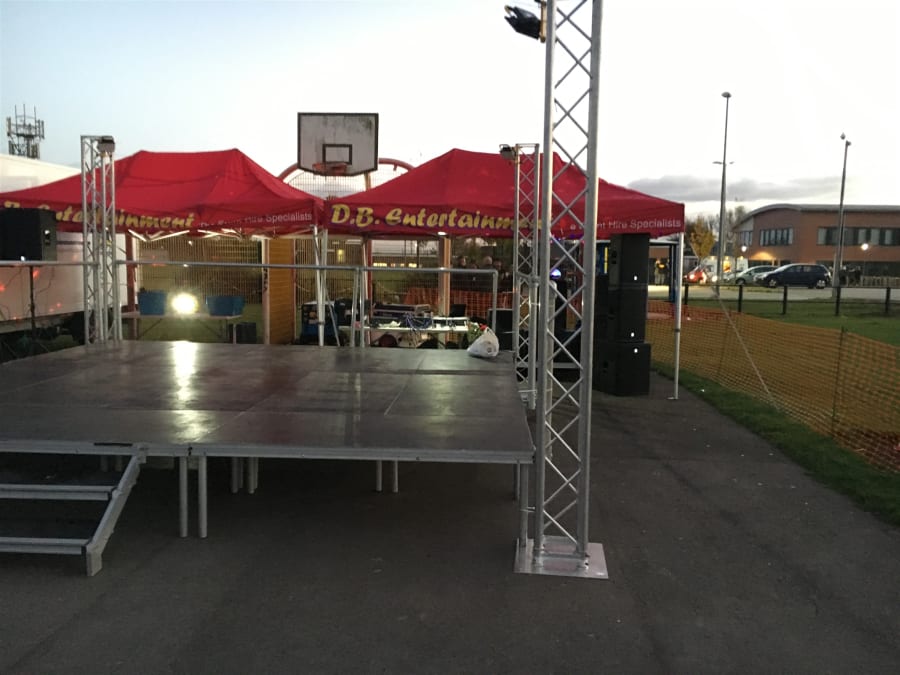 DB Entertainment supplies modular staging in any size, from a compact 3x3m presentation platform up to large festival stages. We carry two styles of staging system in our 25,000 sq ft Rotherham warehouse: lightweight portable platforms that bolt together in custom configurations, and covered truss stages with full roof structures for outdoor events.