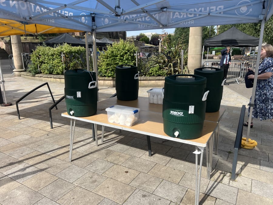 Introducing the ultimate Hydration Station - the perfect solution for providing clean drinking water to a large crowd while minimizing waste and maximizing sustainability. This state-of-the-art station is designed with a marquee and can hold up to 1000 liters of water, making it ideal for use at festivals, charity events, and other large gatherings.