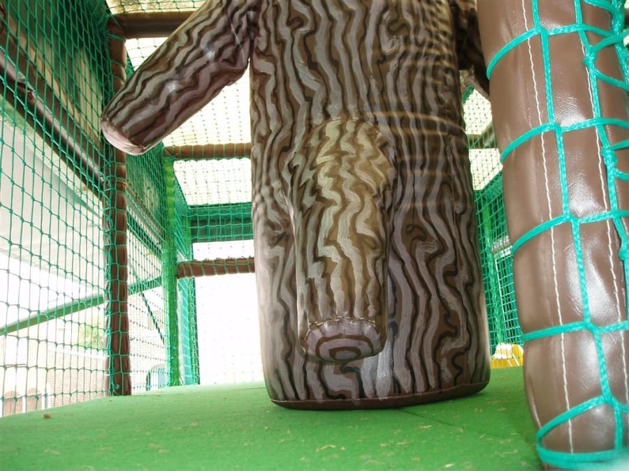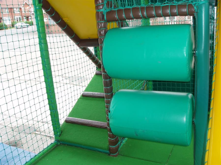 A scramble net and roller squeeze adds to the fun, as well as a soft step to get up or down, a twister and spinner to sit on, and a bish and bash.