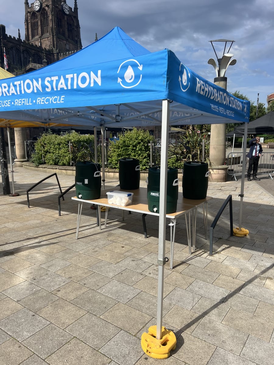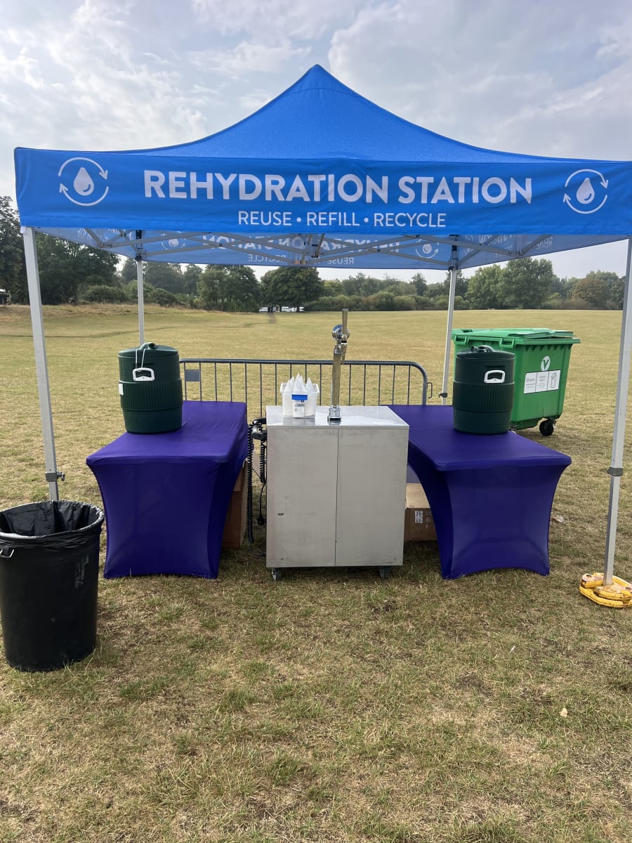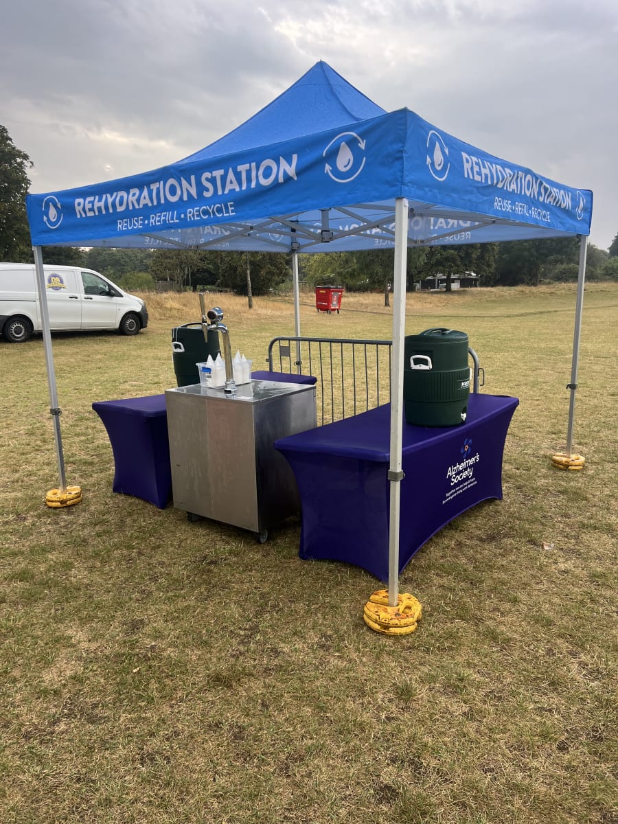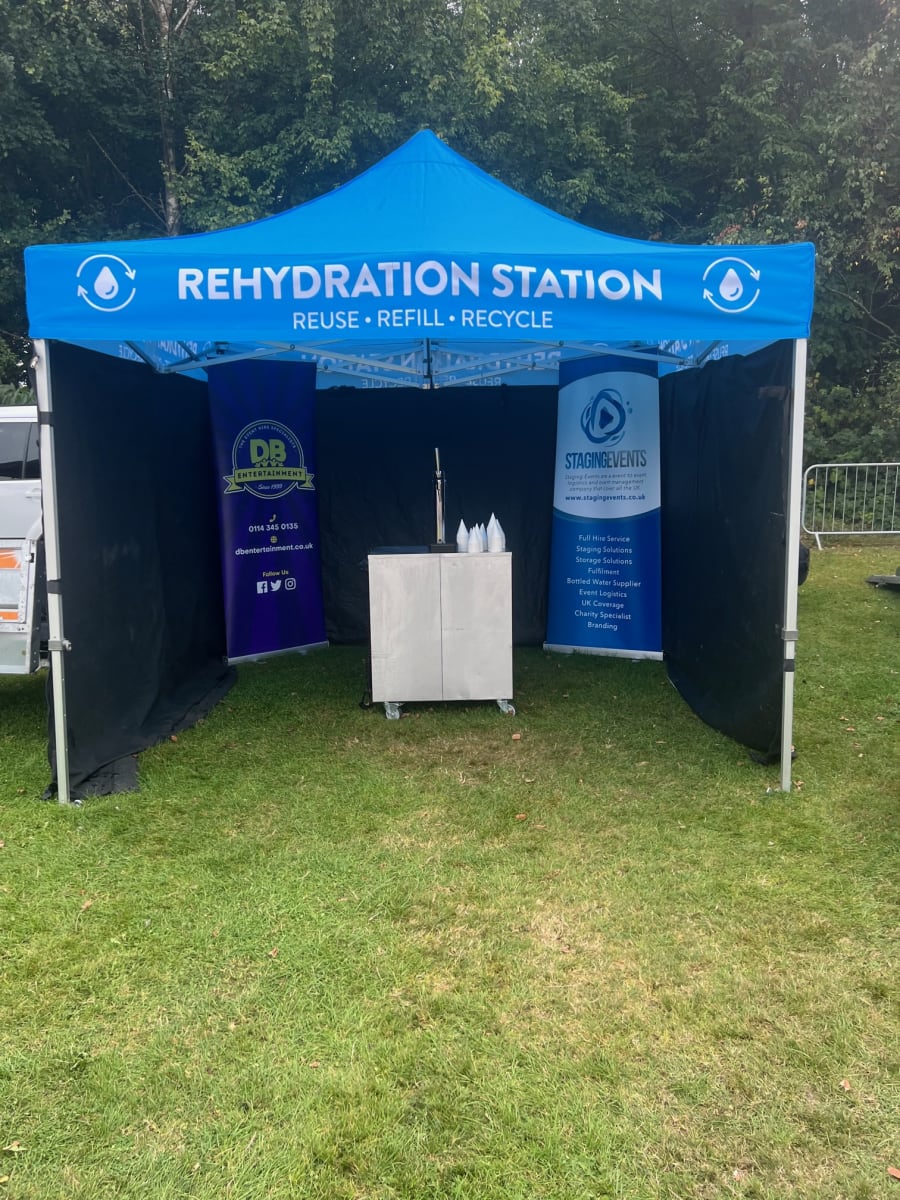 Introducing the ultimate Hydration Station - the perfect solution for providing clean drinking water to a large crowd while minimizing waste and maximizing sustainability. This state-of-the-art station is designed with a marquee and can hold up to 1000 liters of water, making it ideal for use at festivals, charity events, and other large gatherings.