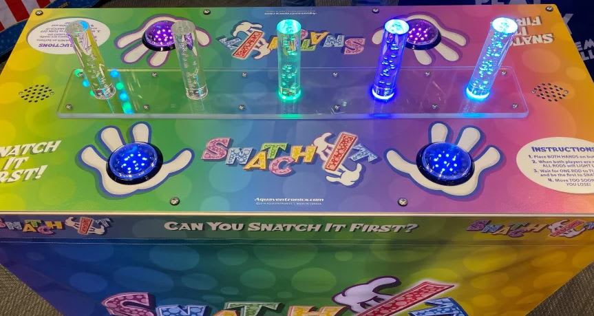 The Snatch It is a two-player reaction game built around one simple idea: grab the lit cylinder before your opponent does. Two players stand either side of the unit, hands hovering over start buttons, waiting for one of the cylinders to light up. The first to grab it scores. Built-in sound effects count down each round and announce the winner, so it runs itself once players step up.
