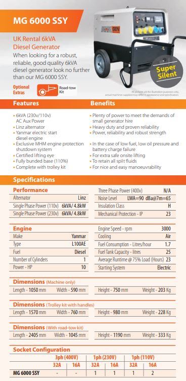 Specifications Performance Alternator Linz Single Phase Power (110v) 6kVA/ 4.8kW Single Phase Power (230v) 6kVA/ 4.8kW Three Phase Power (400v) N/A Noise Level LWA=90 dBa@7m=65 Insulation Class H Mechanical Protection - IP 23 Engine Make Yanmar Type L100AE Fuel Diesel Number of Cylinders 1 Power - HP 10 Engine Speed - rpm 3000 Cooling Air Fuel Consumption - Litres/hour 1.7 Fuel Tank Capacity - litres 25 Average Runtime @ 75% Load (Hours) 23 Starting System Electric Dimensions (Machine only) Length - 1050 mm Width - 590 mm Height - 750 mm Weight - 203 Kg
