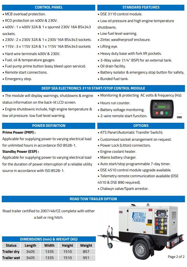 Auto voltage regulation + or - 1.5% / Overload protection for each individual socket / Hard wire connection facility / ELCB fitted to the 400 & 230 volt output.