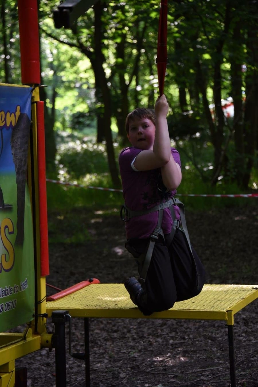 The participant is suspended in the air via a lanyard, (safety line), that is attached to a proprietary overhead track system and a harness AT ALL TIMES while manoeuvring through different tasks and activities.