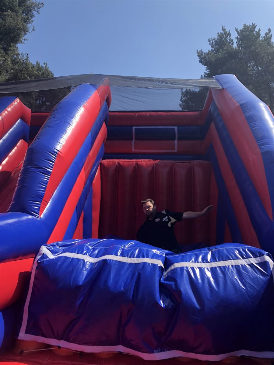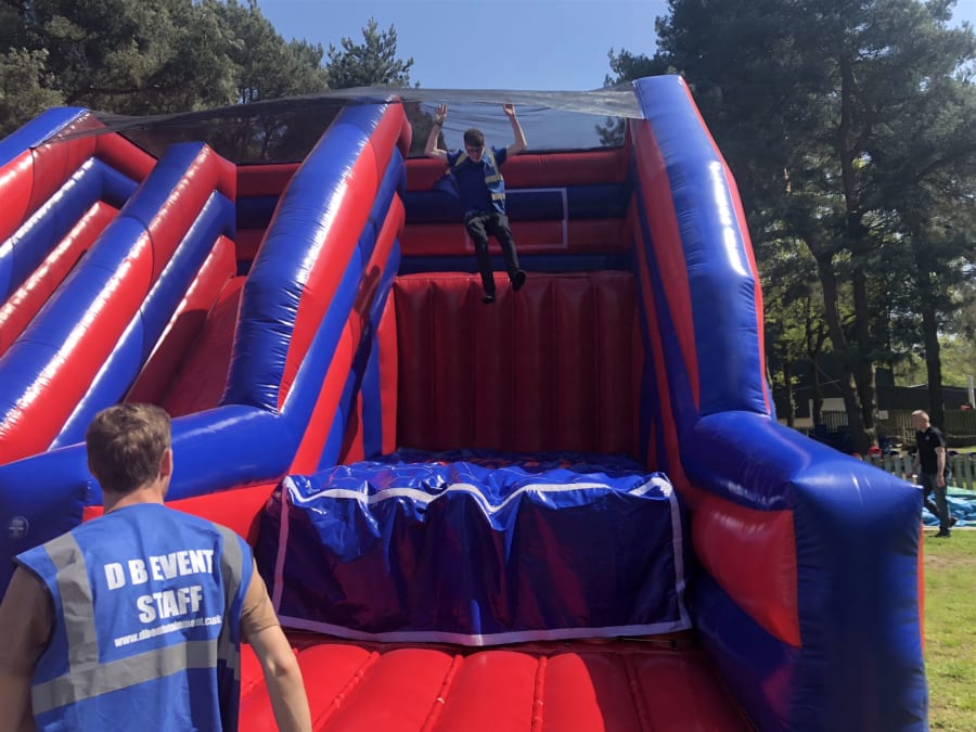 You need to climb to the top of one of the highest inflatables we have, get across to the jumping stand and leap into the target landing pit.