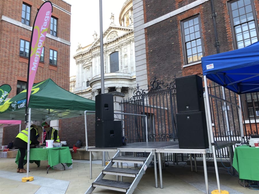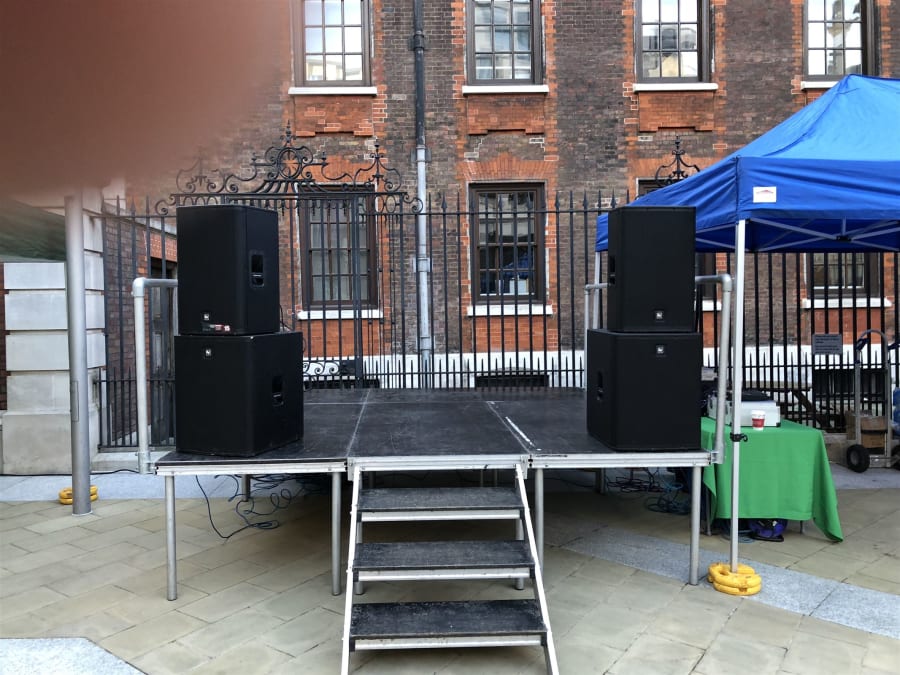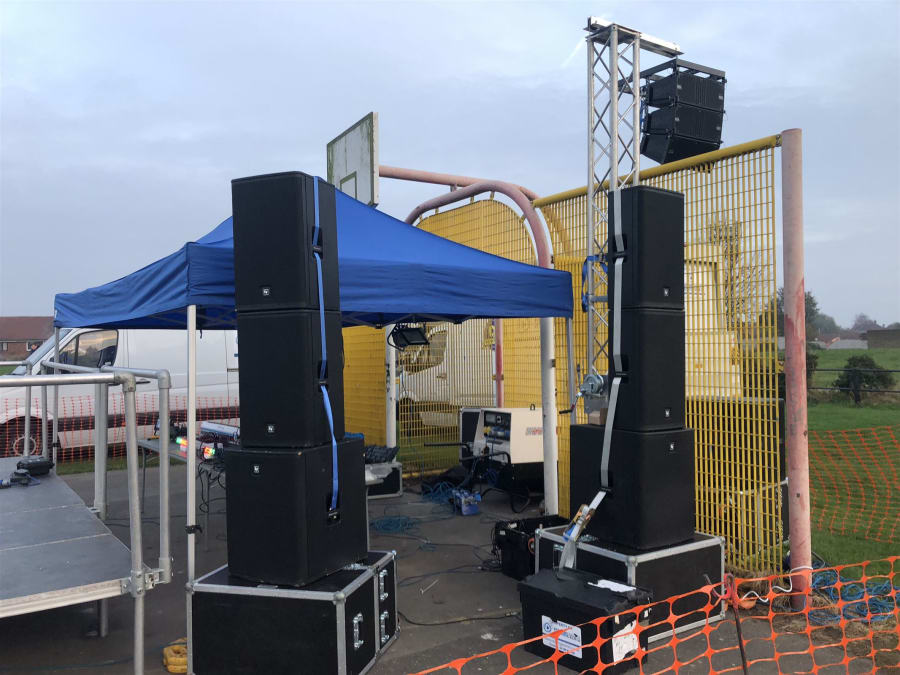Please note the photo shows a DJ on one of our Mini stages which are not included in this price but can be added to a package deal. Also the photos are examples and are not what is included in any start from price. From £195 refers to a 4 k PA hire only unstaffed and for a duration of up to 4 hours. This is only hired to competent sound engineers. Our basic packages include 2 x EV 1000watt base bins and 2 x 15"