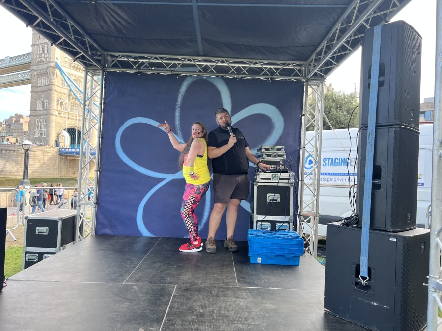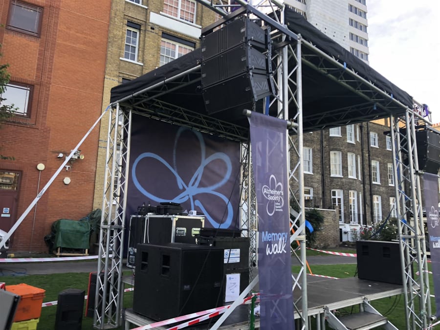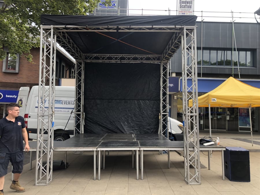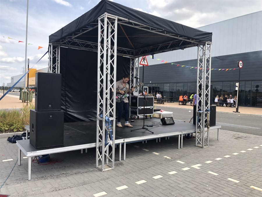 This is a 3x3m mini Trussing stage versatile for many applications including solo or duos, mass participation warm ups, fitness warm ups, light switch on's, Single MC's and DJ sets