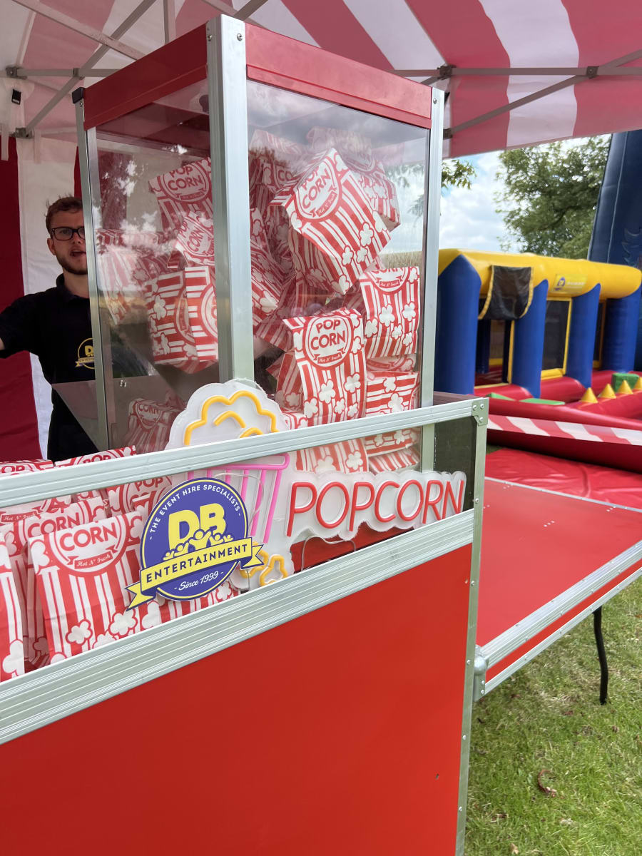 Our pop corn cart for rental requires a normal 13amp plug socket with8in 25m of site Also included is the table and marque if required.