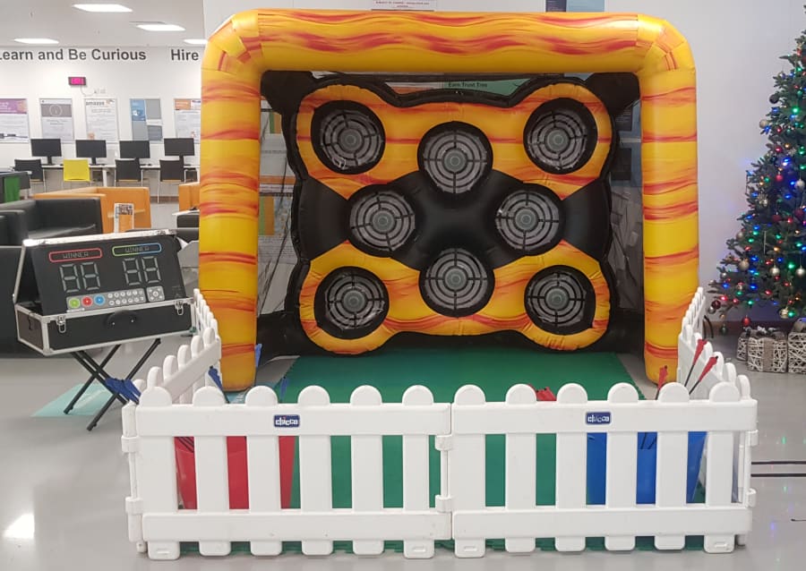 Use body shot arrows to hit the different coloured targets, racing against your partner to hit as many targets as possible. Be quick, you have to hit all the targets within the time allocated. This is a two player game, highly addictive and great to participate as well as watch. Scores are displayed on the electronic board and the winner is displayed at the end of the game. (For younger players, timings can be changed from 30,45 & 60 seconds)